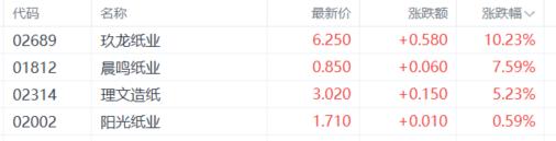 纸业股拉升玖龙纸业涨超10%,晨鸣纸业理文造纸阳光纸业等跟涨。