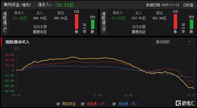 今日,南向资金净卖出35.21亿港元,其中港股通(沪)净卖出21.28亿港元,港股通(深)净卖出13.93亿港元。