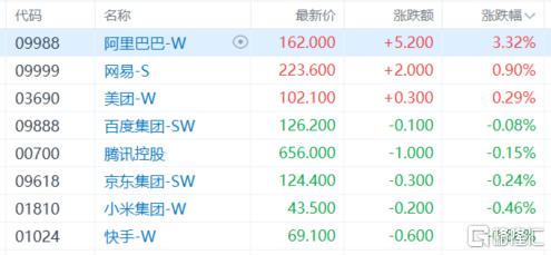 权重科技股涨跌不一,阿里巴巴涨超3%,网易、美团微涨;百度腾讯控股京东、小米、快手微跌。
