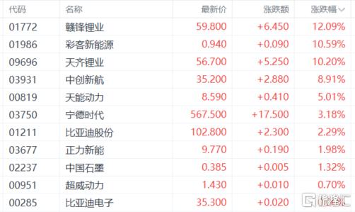 锂电池强势赣锋锂业涨超12%,天齐锂业中创新航天能动力宁德时代等跟涨。
