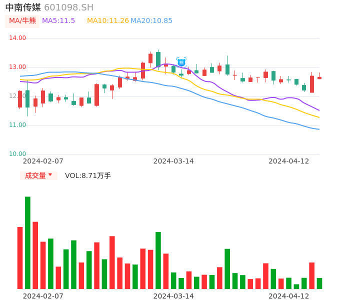 04月12日,中南传媒收报12.65,股价涨幅-0.32%,成交金额1.11亿元,换手率0.48%。