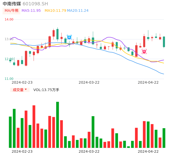 04月22日,中南传媒收报12.61,股价涨幅-3.74%,成交金额1.76亿元,换手率0.77%。