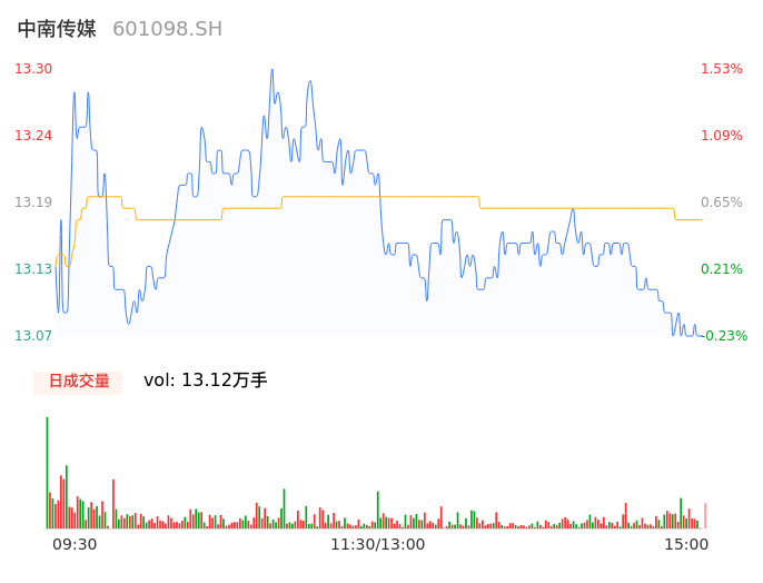 04月18日,中南传媒收报13.07,股价涨幅-0.23%,成交金额1.73亿元,换手率0.73%。