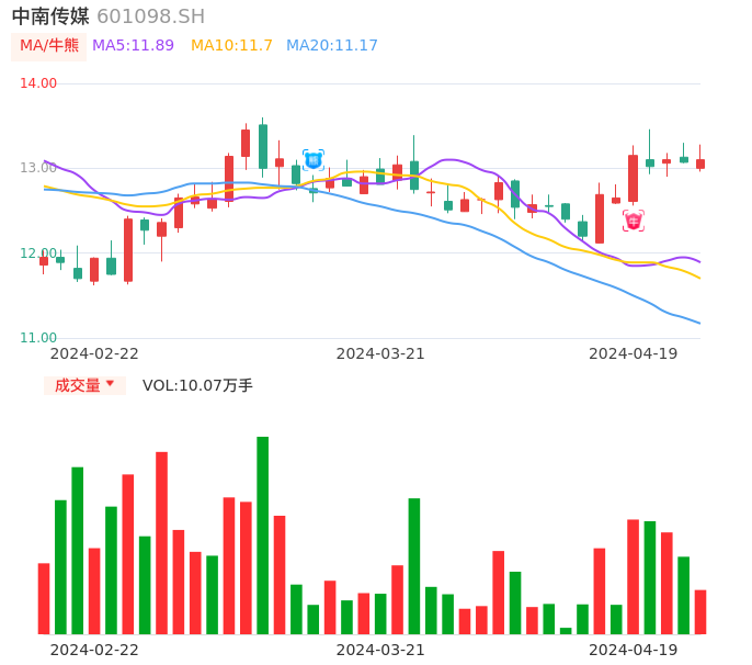 04月19日,中南传媒收报13.10,股价涨幅0.23%,成交金额1.33亿元,换手率0.56%。