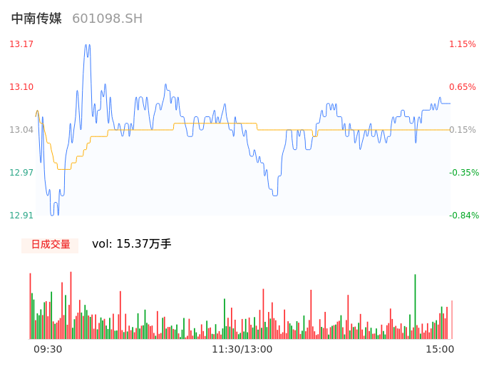 04月17日,中南传媒收报13.10,股价涨幅0.61%,成交金额2.00亿元,换手率0.86%。