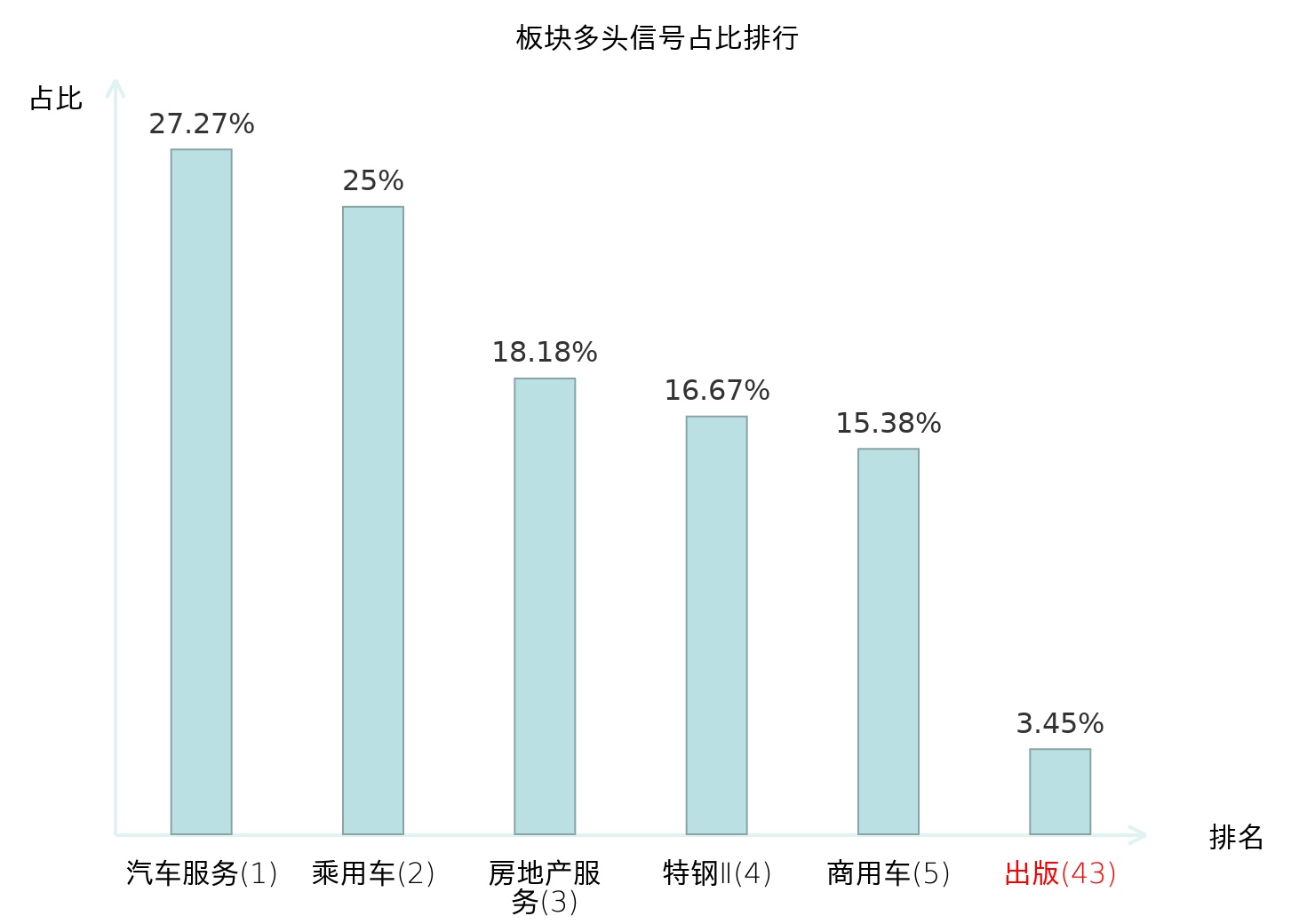 全市场所有行业板块中主力多头信号占比排名中,汽车服务板块位居第一。乘用车板块名次提升最快,较昨日上升117位。