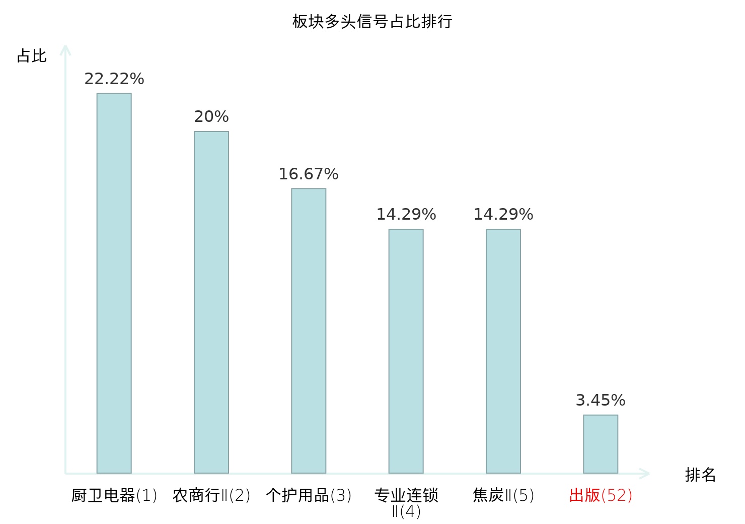 全市场所有行业板块中主力多头信号占比排名中,厨卫电器板块位居第一。专业连锁Ⅱ板块名次提升最快,较昨日上升117位。