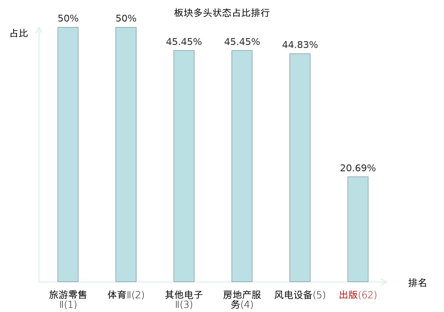 全市场所有行业板块中主力多头状态占比排名中,旅游零售Ⅱ板块位居第一。其他家电Ⅱ板块名次提升最快,较昨日上升112位。