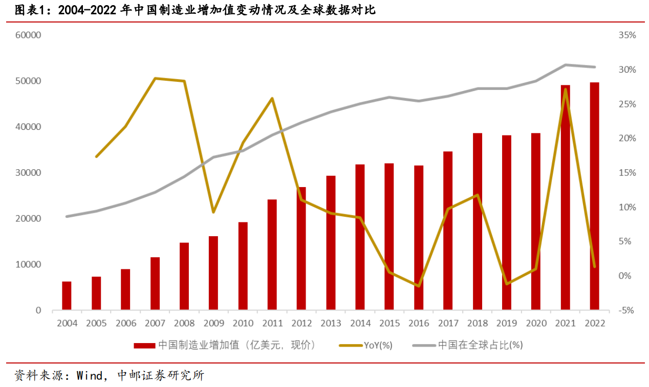 中国稳坐世界制造国龙头地位,制造业增加值占比全球比重不断提升。
