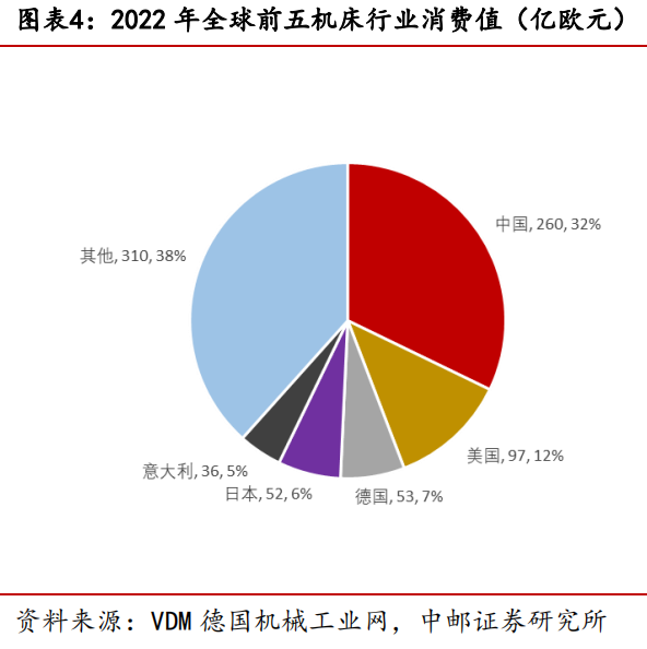 2022 年全球机床行业消费额为808亿欧元,中国同样以260亿欧元的规模稳居市场第一。