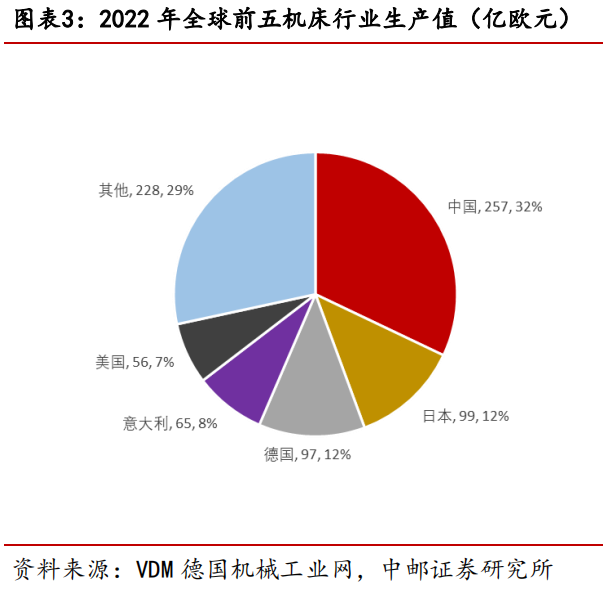 2022 年全球机床行业总产值约803亿欧元,中国以257亿欧元的产值位居全球第一,在全球市场中占据 32%的份额。