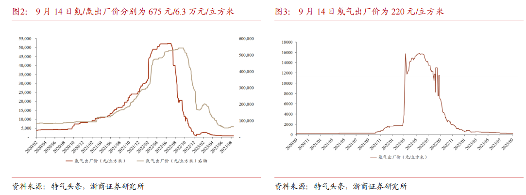 价格来看,根据特气头条数据,2023年9月14日,氪气出厂价为675元/立方,氙气出厂价为6.3万元/立方,氖气出厂价为220元/立方。整体上光刻气体价格已处于2020年以来的底部。未来有望伴随下游集成电路需求企稳回升迎来上涨。