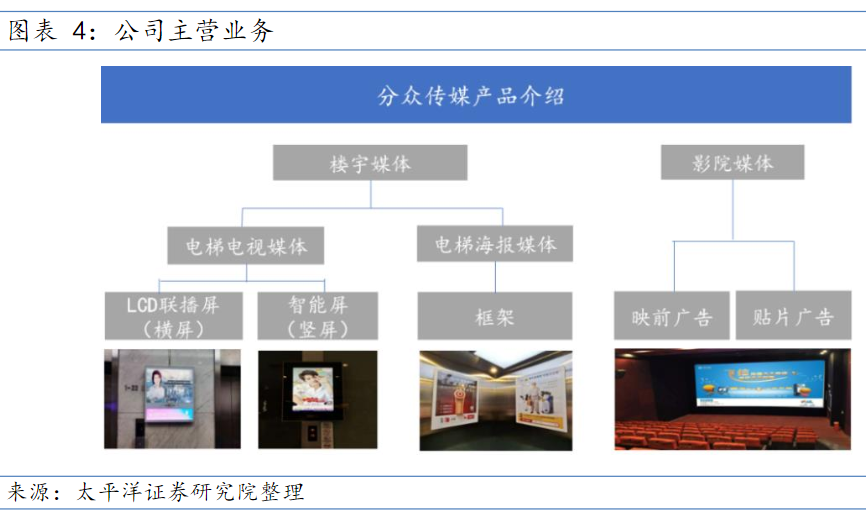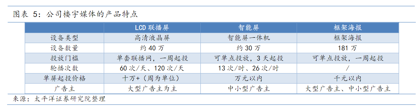 公司2015年回归A股成为中国电梯传媒第一股,2018年以来电梯电视升级为27寸、32寸为主的第五代高清智能大屏,具有广告效果实时监测功能;发布了新一代智能屏,具有千楼千面和分时段的投放功能;电梯海报升级成更大面积的电梯海报3.0,可实现千楼千面投放。