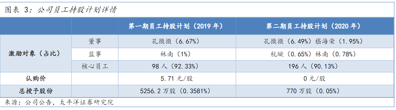 高管及核心员工持股计划锁定人才,利于长期发展,2019至2020年共开展两期员工持股计划。第一期计划于2019年,面向董秘孔微微女士、监事林南先生及98名核心员工,以员工出资认购方式,累计通过二级市场回购股票5256万股,约占总股本0.36%,总金额2.7亿元。第二期于2020年12月,面向4名高管及196名核心技术员工,以年度奖励为主,授予股票0元/股,共授予770万股,约占总股本0.05%。
