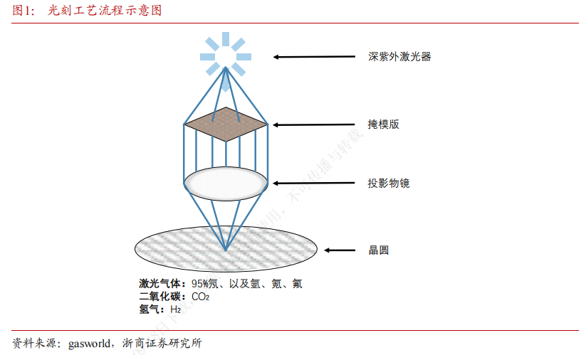 光刻是指通过涂胶、曝光、显影等工艺,利用化学反应进行微细加工图形转移的技术工艺。在光刻过程中,光刻气体是光刻工艺所需要的重要材料。在受到高压激发后,这些光刻混合气会形成等离子体,固定波长的光线在经过聚合、滤波等过程后形成光刻机光源,为制造更小型化、高集成度的集成电路提供了关键支持。