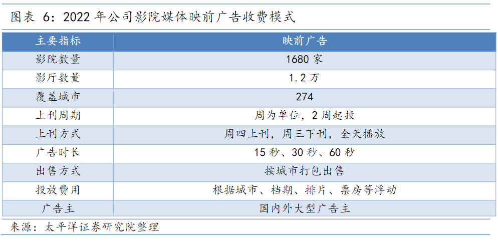 公司打通电影发行产业链,影院广告覆盖率稳居龙头,与影院深度合作,通过打通制片、发行、宣传、购票、放映的各个环节,进一步整合优化了影院媒体资源,借助资源优势,公司推出了涵盖全国银幕映前联播网、线下阵地广告、影片贴片授权的“影院+”综合产品链。并且通过购买影院影片放映前5-10分钟广告发布权组成全国银幕映前联播网,并与1680家影院媒体签约,约1.2万个影厅,覆盖国内274个城市的观影人群,稳居业内首位。