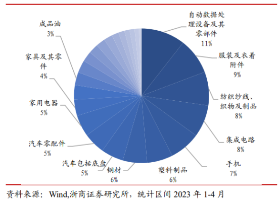从存量上看,机电、集成电路等高附加值产业份额保持高位。机电产品是我国主要出口的产品,属于高附加值产品。2018-2022年,机电产品出口份额保持高位,平均占出口总额的比重为 59%。2023年上半年我国机电产品出口6.66万亿元,同比增长6.3%,占出口总值的58%,其中,电工器材、汽车及其零配件、通用机械设备分别增长27.7%、58.5%、12.2%。
