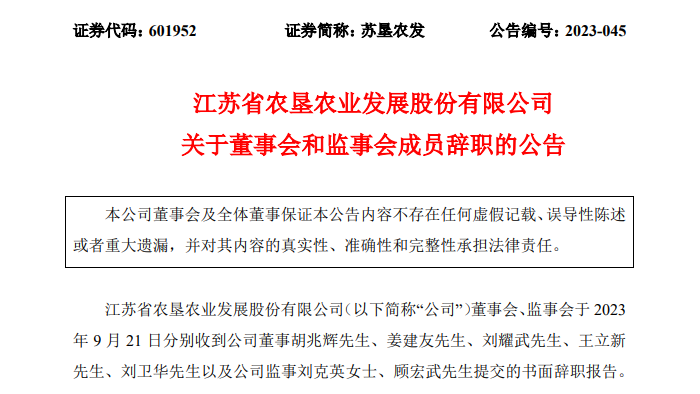 9月21日晚间,苏垦农发(601952)披露公告称,公司董事会、监事会于9月21日分别收到公司董事胡兆辉、姜建友、刘耀武、王立新、刘卫华以及公司监事刘克英、顾宏武提交的书面辞职报告。