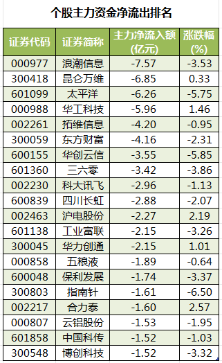 此外,3210只个股被主力资金净卖出,其中,42股被主力资金净卖出超1亿元。主力资金净流出最多的个股是浪潮信息,净流出金额为7.57亿元;主力资金净流出居前的个股还有昆仑万维、太平洋、华工科技、拓维信息、东方财富,净流出金额分别为6.85亿元、6.26亿元、5.96亿元、4.2亿元、4.16亿元。