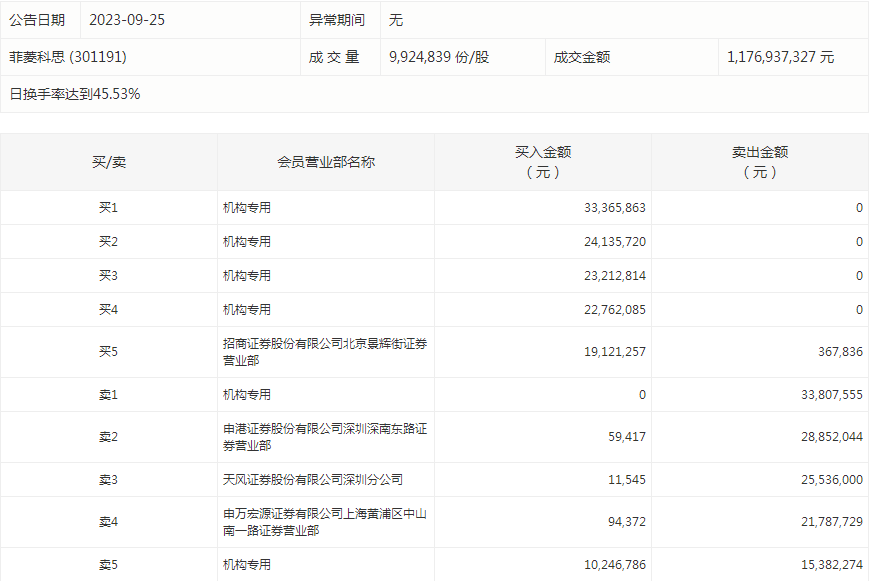 菲菱科思今天涨11.04%。盘后数据显示,6个机构出现在龙虎榜单上,合计净买入6453.34万元;招商证券股份有限公司北京景辉街证券营业部买入1912.13万元,同时卖出36.78万元;申万宏源证券有限公司上海黄浦区中山南一路证券营业部买入9.44万元,同时卖出2178.77万元。