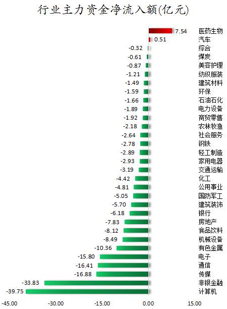 从行业板块来看,申万所属的31个一级行业,今日仅有医药生物、汽车2个行业板块主力资金呈现净流入,净流入金额分别为7.54亿元、0.51亿元。29个行业板块主力资金呈现净流出,其中,计算机行业板块主力资金净流出最多,净流出金额为39.75亿元;行业板块主力资金净流出靠前的还有非银金融、传媒、通信、电子、有色金属,净流出金额分别为33.83亿元、16.88亿元、16.41亿元、15.8亿元、10.36亿元。