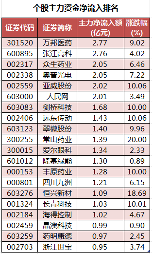 个股来看,今日有1838个股获主力资金净流入,其中,17股获主力资金净流入超1亿元。万邦医药获主力资金净流入最多,净流入金额为2.77亿元;主力资金净流入居前的个股还有张江高科、众生药业、奥普光电、亚威股份、人民网,流入金额分别为2.76亿元、2.05亿元、2.05亿元、2.02亿元、2.01亿元。