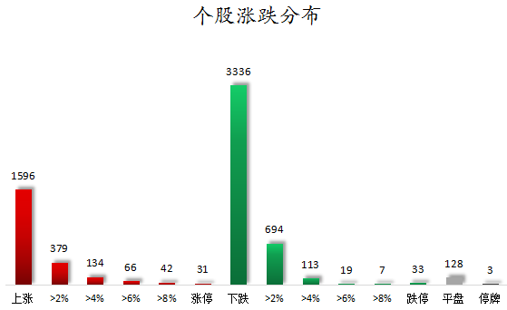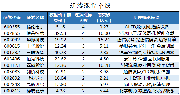 截至收盘,沪深两市合计1596只个股上涨,3336只个股下跌,平盘个股128只,停牌的个股3只。不含当日上市新股,共有31只个股涨停,33只个股跌停。连续涨停天数看,捷荣技术、精伦电子均已连收4个涨停板,连续涨停板数量最多。