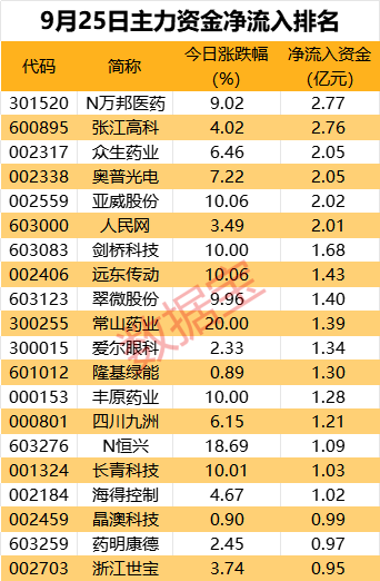 从个股看,沪深两市17股主力资金净流入超1亿元。其中N万邦医药、张江高科、众生药业、奥普光电获主力分别抢筹超2亿元。