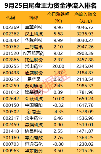 个股方面,卓翼科技、汉王科技、华脉科技尾盘获主力抢筹超3000万元。上海瀚讯、N万邦医药、钧达股份、常山药业等尾盘主力资金净流入均超2000万元。