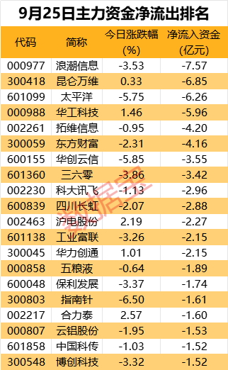 13股主力净流出超2亿元,浪潮信息、昆仑万维、拓维信息等AI牛股遭主力抛售,均净流出超4亿元;太平洋、东方财富等非银金融股主力净流出超4亿元。