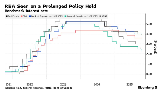 在澳洲联储预计按兵不动的几天前,美联储已连续第二次会议下调关键利率。尽管美联储立场偏向鹰派,但由于就业增长放缓,市场仍认为美联储在12月再次放松政策的可能性较大。