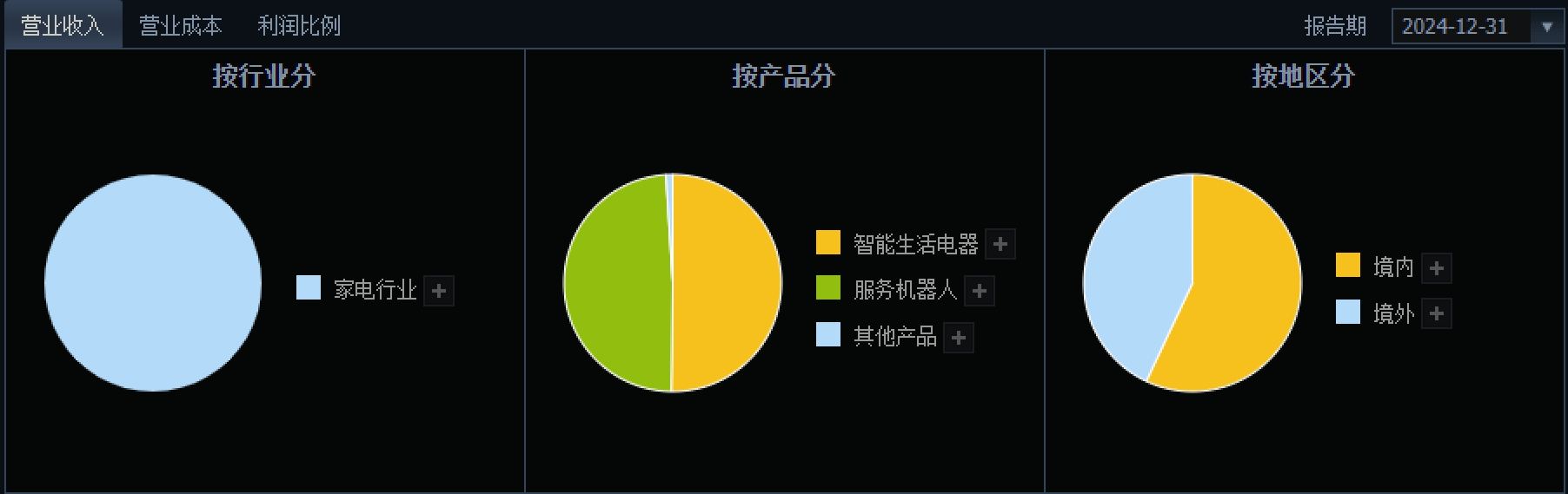 B)分产品:2024年公司服务机器人/智能生活电器/其他产品收入分别达80.82亿元(+4.39%)/83.19亿元(+8.58%)/1.41亿元(+43.40%),其中添可品牌收入达80.61亿元(+10.87%),实现双位数增长。