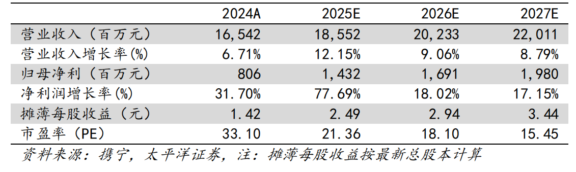 太平洋证券预计,2025-2027年公司归母净利润分别为14.32/16.91/19.80亿元,对应EPS分别为2.49/2.94/3.44元,当前股价对应PE分别为21.36/18.10/15.45倍。维持“买入”评级。