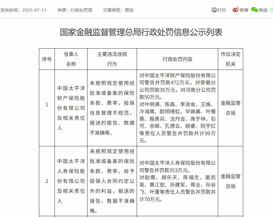 金融监管总局决定对中国太平洋财产保险股份有限公司警告并罚款472万元,对安徽分公司罚款30万元,对河南分公司罚款50万元;对叶明满、陈森、李淑会、王姝、冷海鹰、欧阳晴虹、毕姝晨、叶蜀蓉、殷勇兵、沈丹吉、席于林、石可、余辉、孔德云、姚睿、阮宇红等责任人员警告并罚款共计99万元。