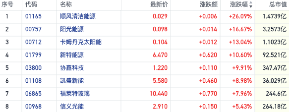 截至发稿,顺风清洁能源(01165.HK)大涨超26%,阳光能源(00757.HK)涨近17%,新特能源(01799.HK)等多只个股也跟涨约10%左右。