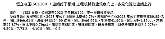 值得注意的是:2024年04月浙商证券的邱世梁/王华君/胡飘分析师,首次发布关于恒立液压的研究报告,标题为:恒立液压(601100):业绩好于预期 工程机械行业筑底向上+多元化驱动业绩上行。