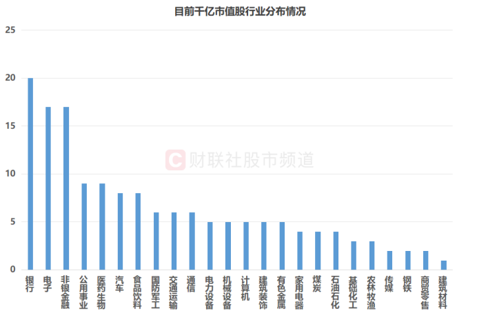 注:目前千亿市值股行业分布情况(截至8月20日收盘,总市值以A股收盘价*A股合计+H股收盘价*H股合计等,下同)