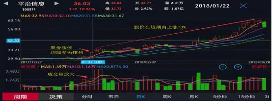 热点,也表明有资金。这类型多头排列股票,拉升更有力度。均线上扬角度越大,拉升力度也高。并且股价调整遇到均线支撑也更稳固。均线多头排列是上涨的信号。但在实际的操作过程中,如果只注重了指标的表面应用,却忽略了其他重要因素,因而在刚形成多头排列时就急于买入,后期很容易遭遇股价的快速下挫。所以在技术分析过程中,要注重量价配合,分析“量”时,有成交量、资金筹码的集中分散等角度,分析“价”时,有K线形态、均线以及支撑压力等角度。因此,在分析均线多头排列时,还需要结合K线力度、成交量的缩放以及资金筹码集中情况来看待。具体来说,K线力度方面,最强的当属涨停;成交量方面,应处于放大状态;资金应是流入,筹码应该集中。从上图可以看出,平治信息通过放量涨停,完成中短期均线系统多头排列,资金不断流入,筹码不断集中,量、价与资金筹码形成共振,在2018年弱势环境下,该股短期内仍涨超70%。从上图可以看出,恒立液压在2017年10月31日已完成中短期均线系统多头排列,股价此时放量涨停,资金不断流入,筹码不断集中。量、价及资金筹码形成多头共振,后期股价震荡上行,涨幅近60%。通过以上两个例子可以看出,如果在中短期均线完成多头排列前,资金持续流入,筹码不断集中,同时,放量涨停释放信号,那么,股价后期持续上涨的可能性会更大。