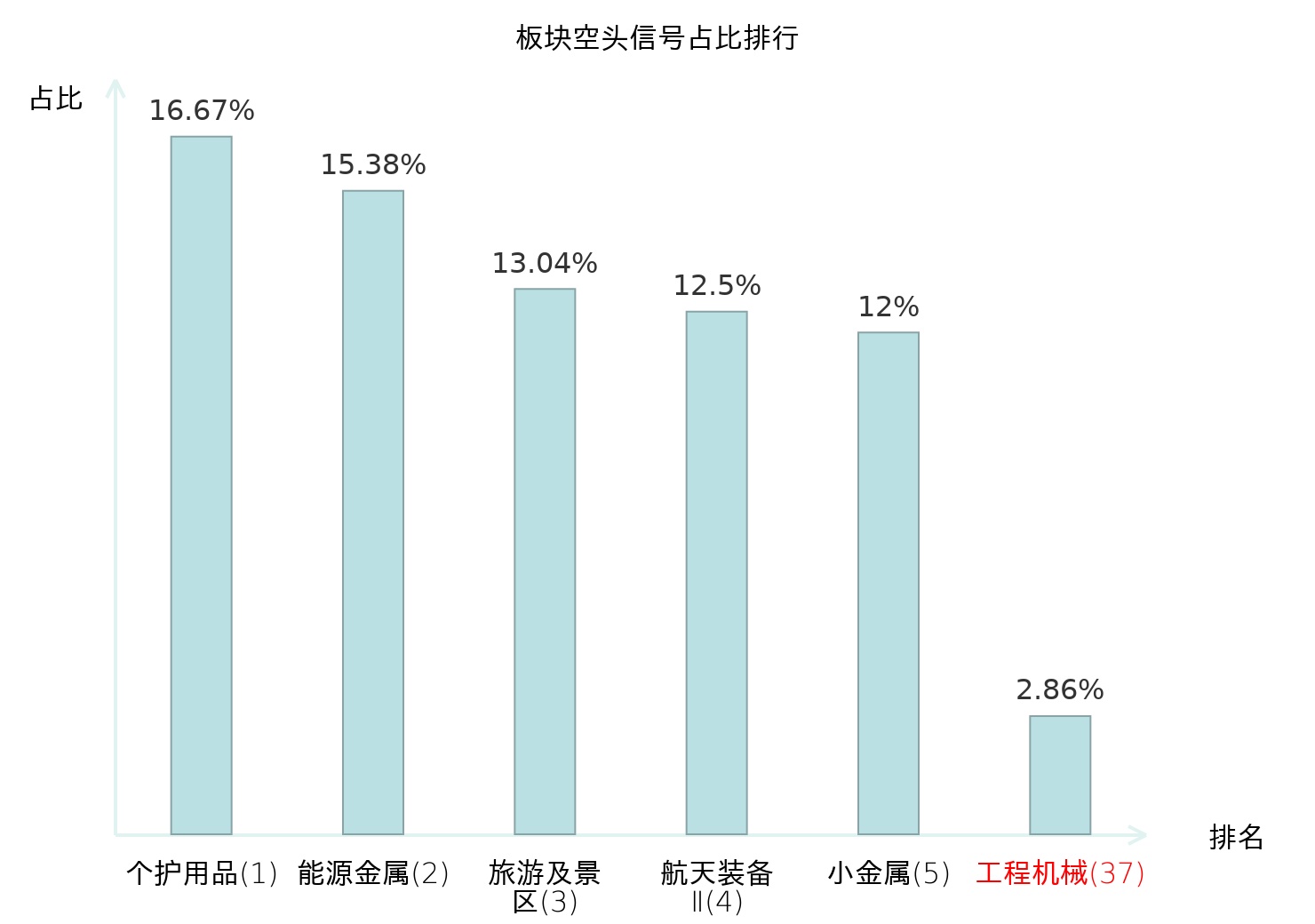 全市场所有行业板块中主力空头信号占比排名中,个护用品板块位居第一。元件板块名次提升最快,较昨日上升106位。