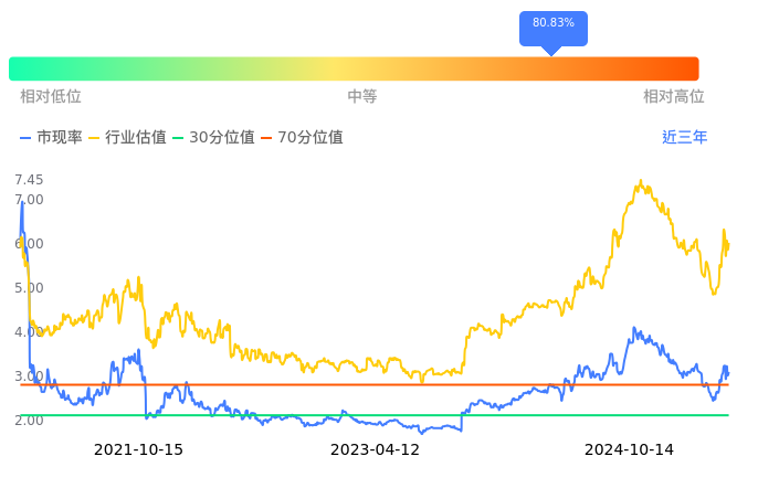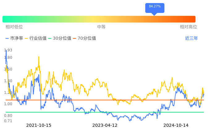 昊华能源当前市净率PB为1.18,在所属的煤炭开采中,市净率PB排14,前五名分别为永泰能源市净率0.62、上海能源市净率0.77、开滦股份市净率0.79、辽宁能源市净率0.79、兰花科创市净率0.86。昊华能源当前市净率PB为1.18,超过近3年84.27%的历史数据。