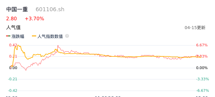 04月15日,中国一重收报2.80,股价涨幅3.70%,成交金额1.92亿元,换手率1.00%。