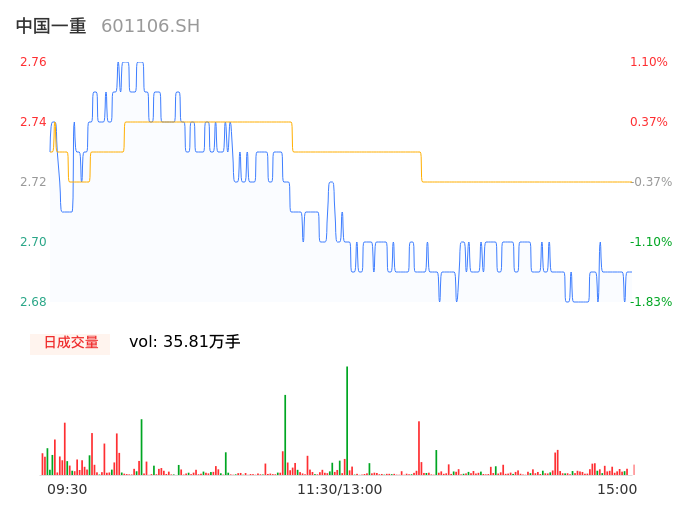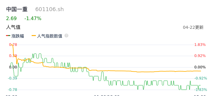04月22日,中国一重收报2.69,股价涨幅-1.47%,成交金额9725.99万元,换手率0.52%。