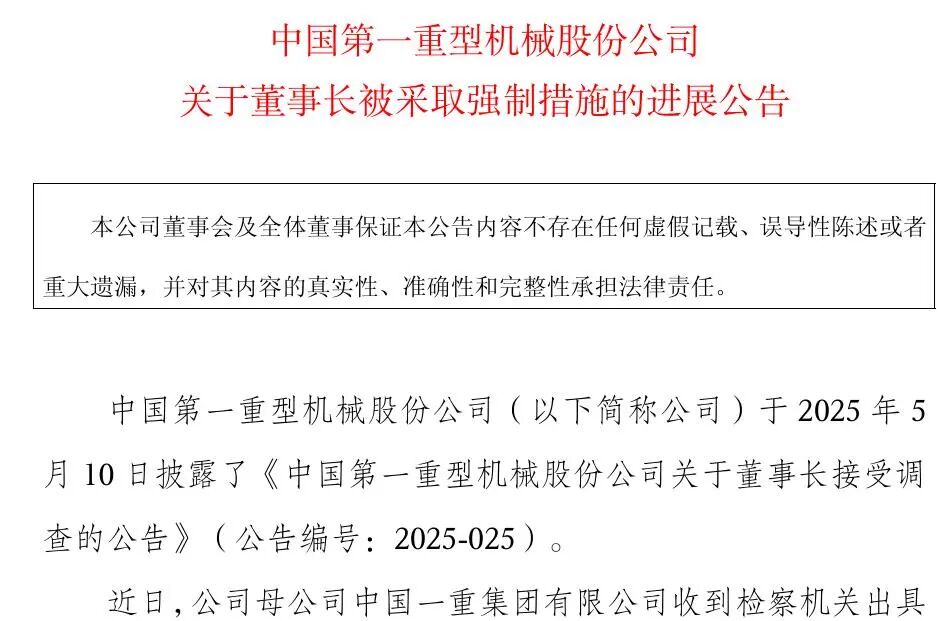 此前公司于2025年5月10日披露了《中国第一重型机械股份公司关于董事长接受调查的公告》。公司法定代表人、董事长、党委书记陆文俊涉嫌严重违纪违法,目前正接受中央纪委国家监委纪律审查和监察调查。