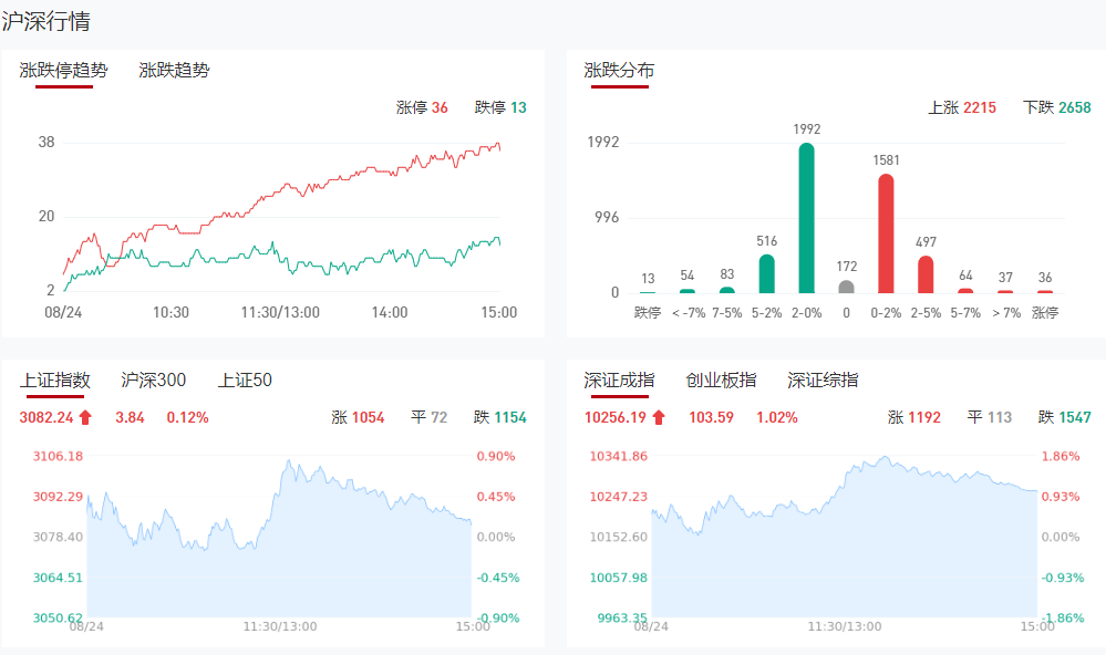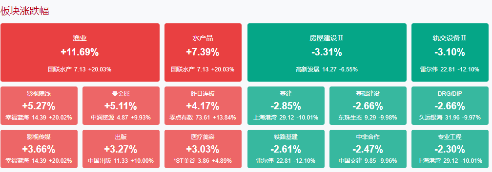 盘面上,核废水污染概念股午后全线走强,其中水产养殖股大涨,国联水产、好当家、中水渔业等涨停;核废水治理及环保股午后走强,中电环保、实朴检测20CM涨停,正和生态上演“地天板”;盐业股表现活跃,江盐集团3连板。传媒影视股震荡走强,幸福蓝海、上海电影、金逸影视、横店影视等涨停。券商股盘中冲高,国盛金控涨停。光伏等新能源赛道股盘中反弹,钧达股份涨停。下跌方面,次新股集体大跌,国泰环保、C众辰等多股跌超10%。信创概念股展开调整,太极股份、深桑达A跌停。板块方面,养殖、传媒、黄金、白酒等板块涨幅居前,次新股、高铁、减速器、国资云等板块跌幅居前。