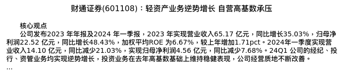 值得注意的是:2024年05月中信建投证券的赵然/吴马涵旭分析师,首次发布关于财通证券的研究报告,标题为:财通证券(601108):轻资产业务逆势增长 自营高基数承压。