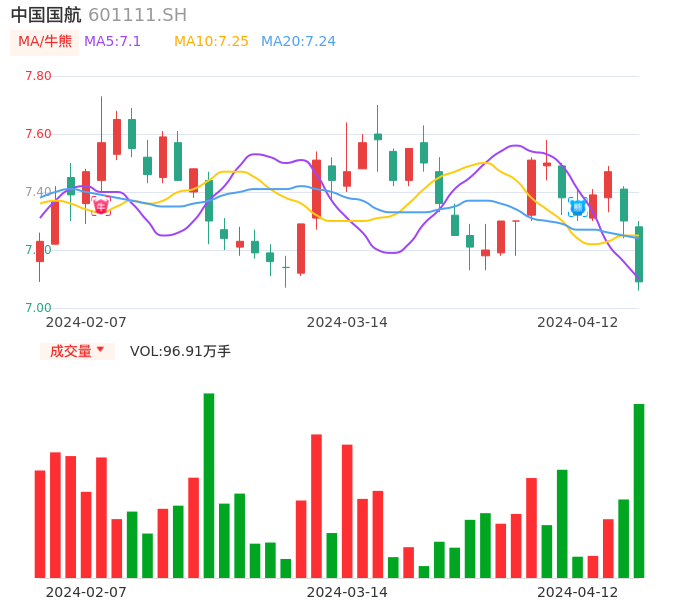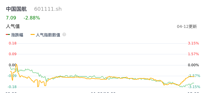 04月12日,中国国航收报7.09,股价涨幅-2.88%,成交金额6.94亿元,换手率0.88%。