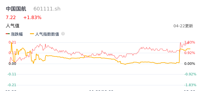 04月22日,中国国航收报7.22,股价涨幅1.83%,成交金额4.90亿元,换手率0.62%。