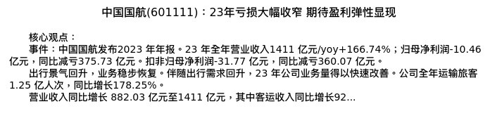 值得注意的是:2024年04月广发证券的许可/代川分析师,首次发布关于中国国航的研究报告,标题为:中国国航(601111):23年亏损大幅收窄 期待盈利弹性显现。