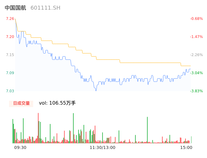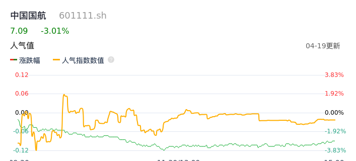 04月19日,中国国航收报7.09,股价涨幅-3.01%,成交金额7.58亿元,换手率0.97%。