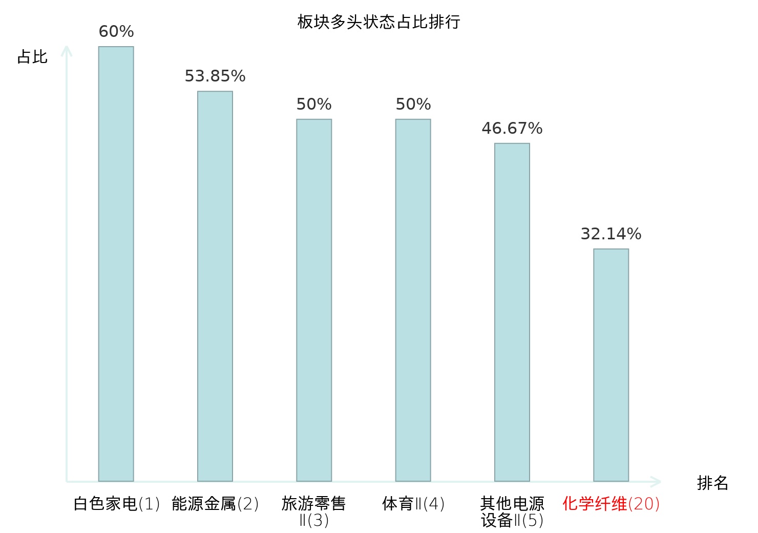 全市场所有行业板块中主力多头状态占比排名中,白色家电板块位居第一。体育Ⅱ板块名次提升最快,较昨日上升127位。